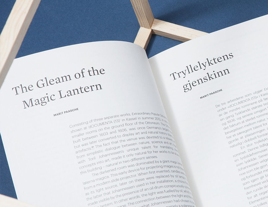 The Gleam of the Magic Lantern was published in Dublett – Toril Johannessen, an anthology with texts by Espen Sommer Eide, Peter Galison, Mette Karlsvik, Marit Paasche and Theodor Ringborg. Edited by Eva Rem Hansen and Maria Lyngstad Willassen. Dublett series editor: Anne Szefer Karlsen. Published by Hordaland Art Centre, Bergen, 2013.